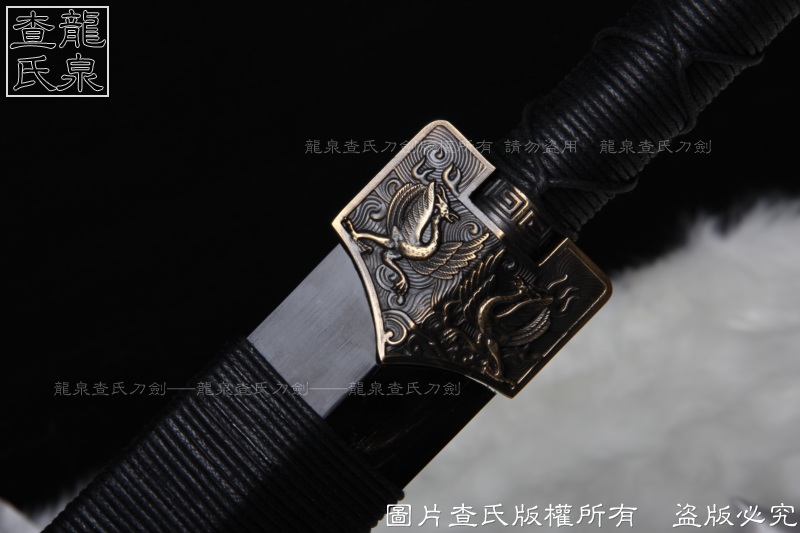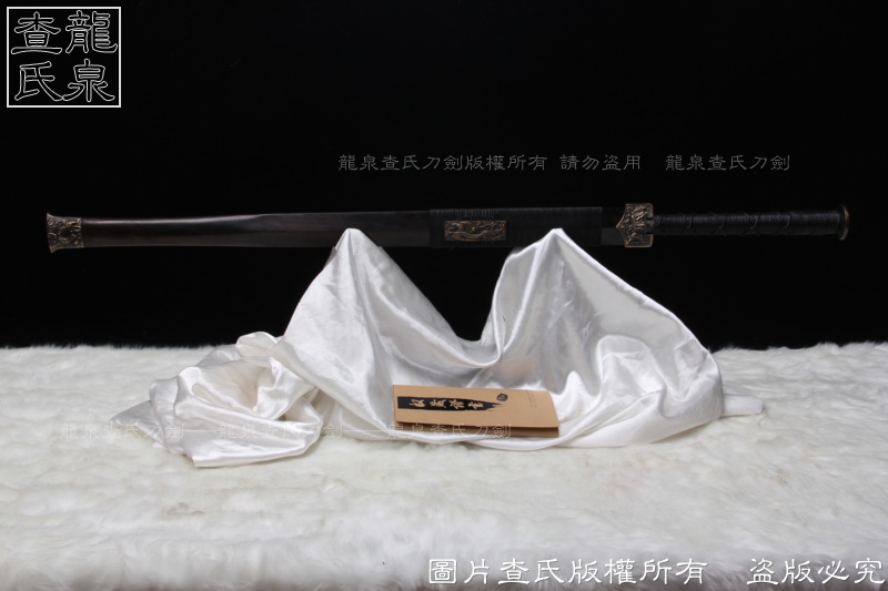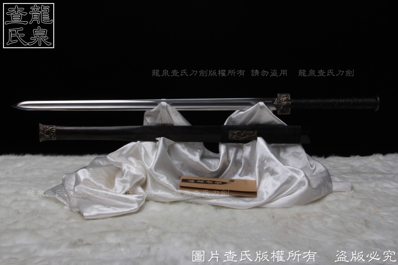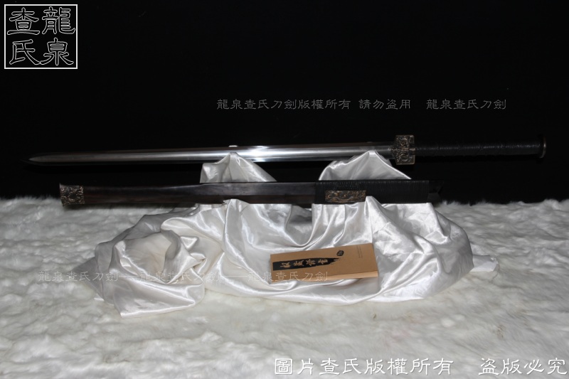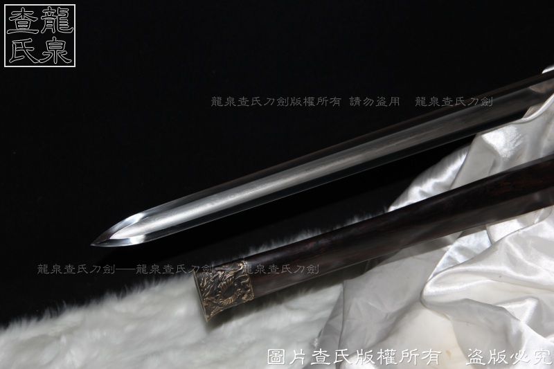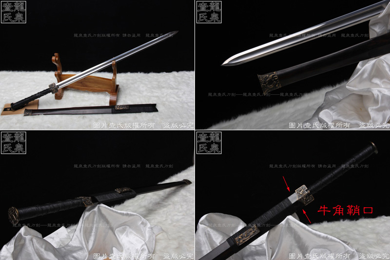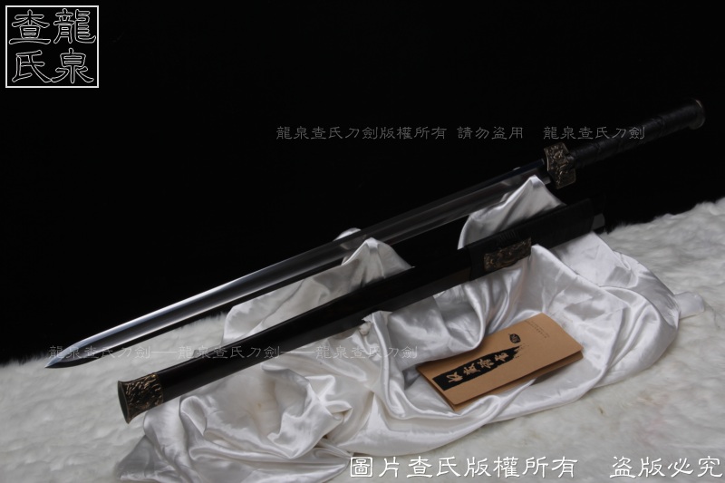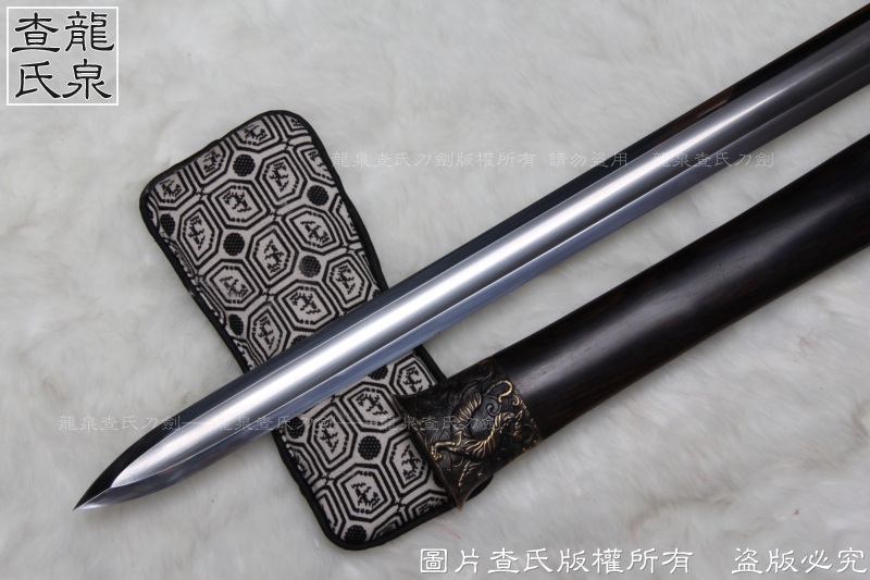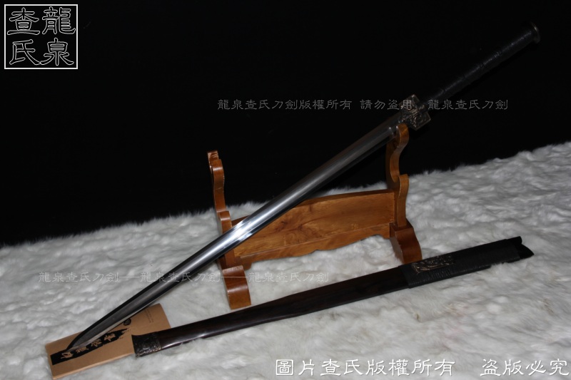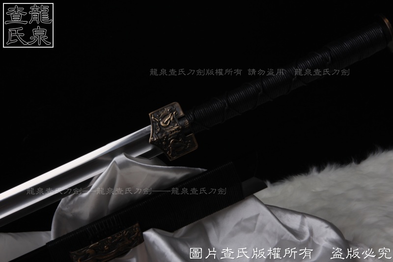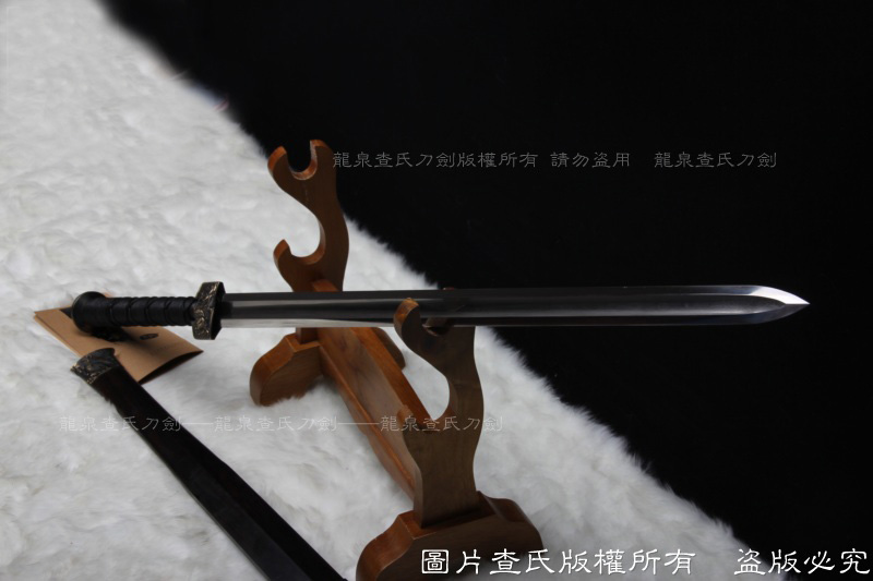 【工艺】 查氏百炼钢古法打造 古法热处理, 手工精细磨,剑采用中间凹槽结构。这个是凹槽结构源于三国时期战剑风格,减轻重量的同时,保证了剑的强度。