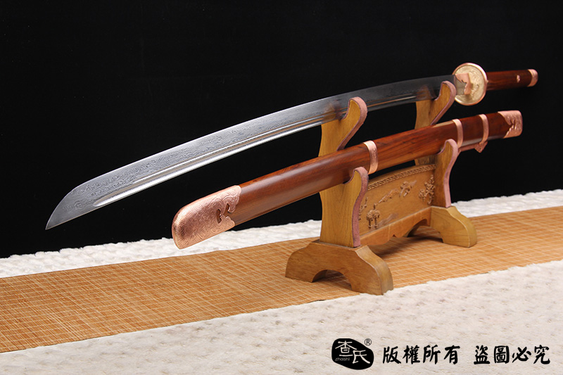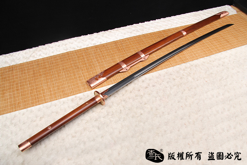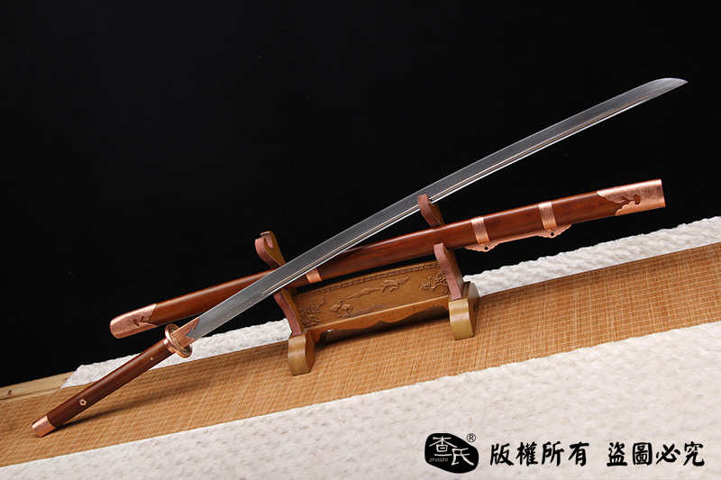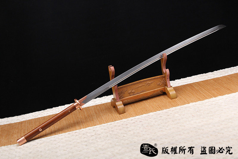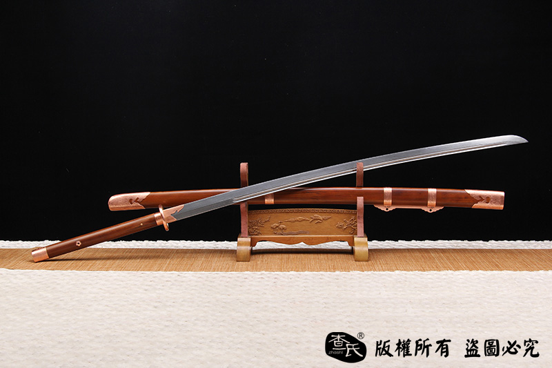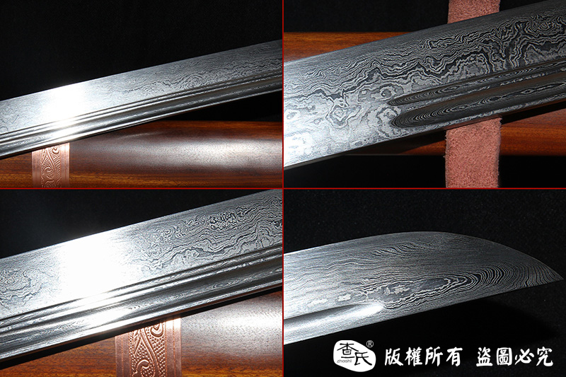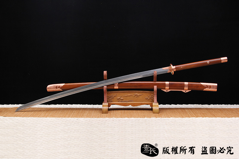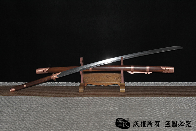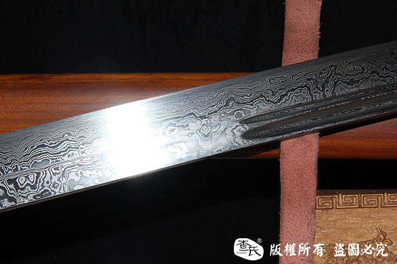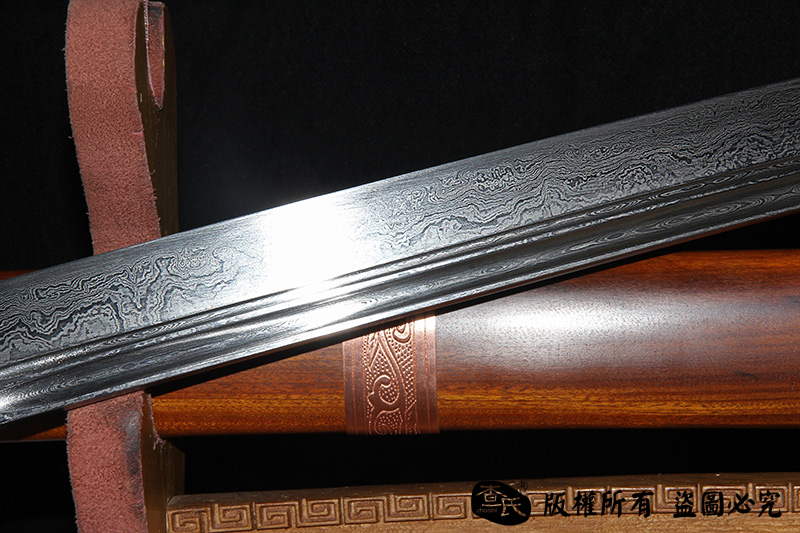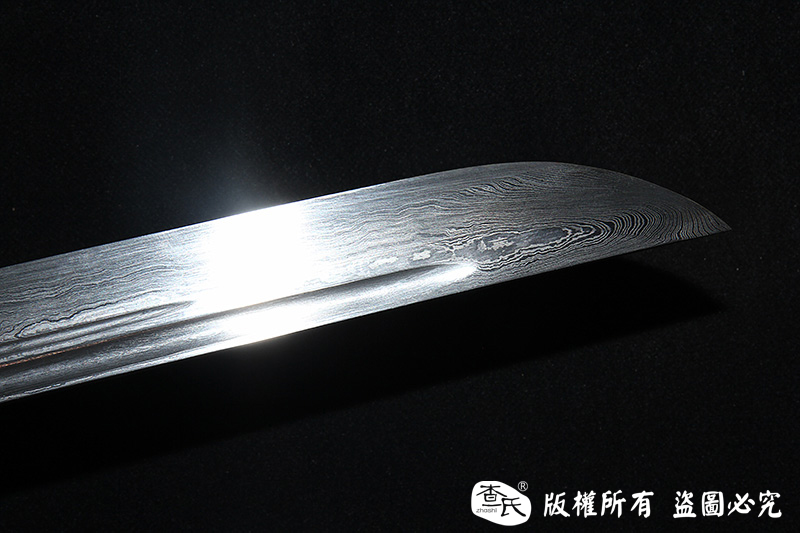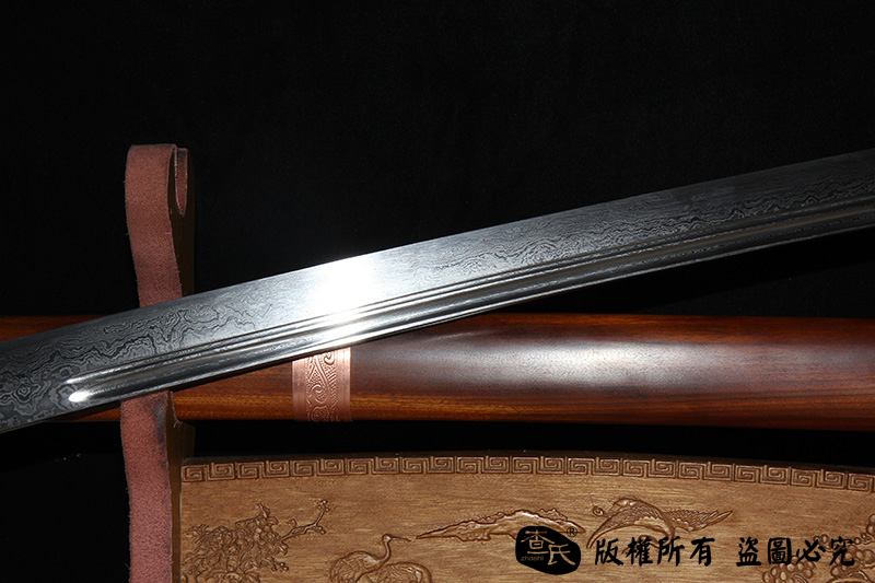 【作品规格】 全长:157cm左右,柄长:38.5cm,刃长:111cm,刃宽:3.99cm,刃厚:1.03cm,重量:不带鞘2.332kg左右,带鞘3.498kg左右。【作品刃材】 查氏锻造花纹钢