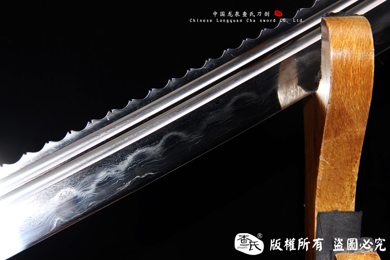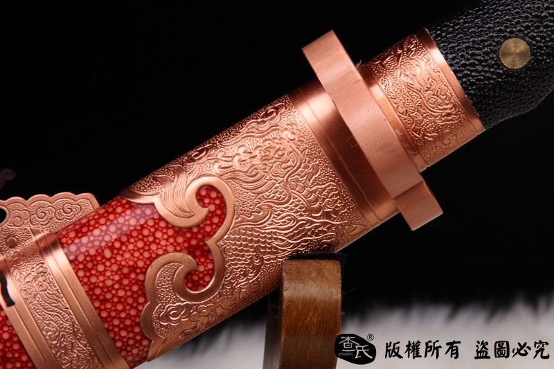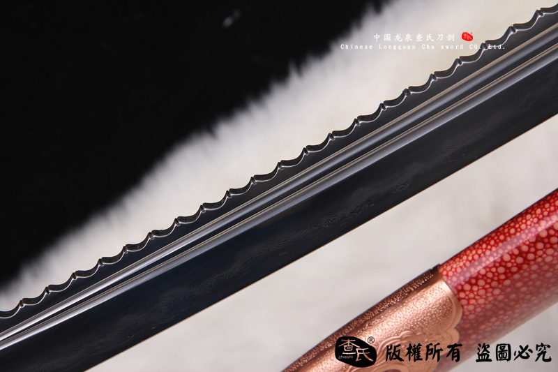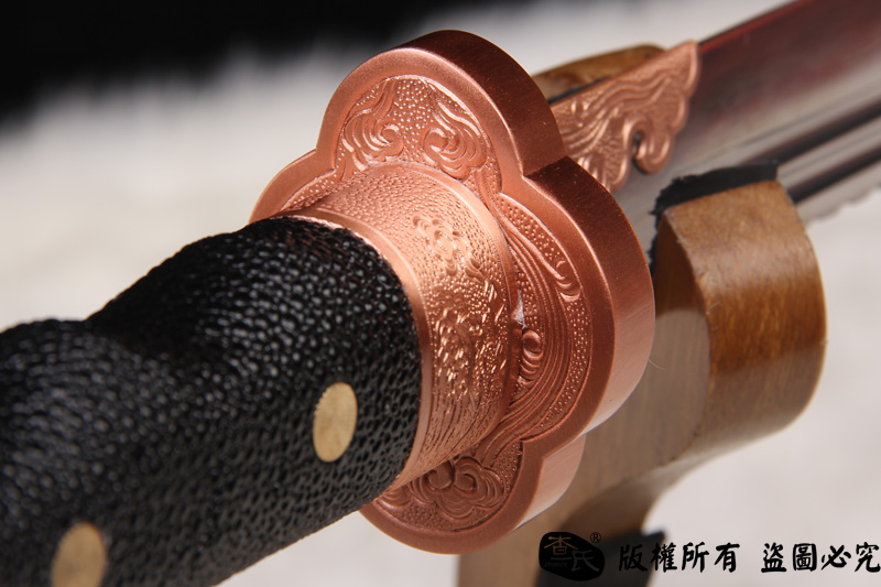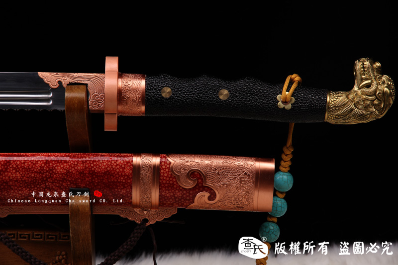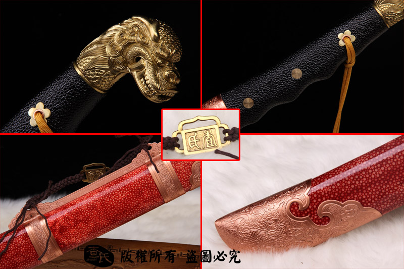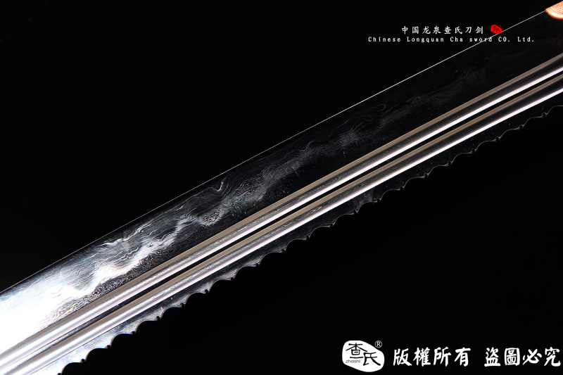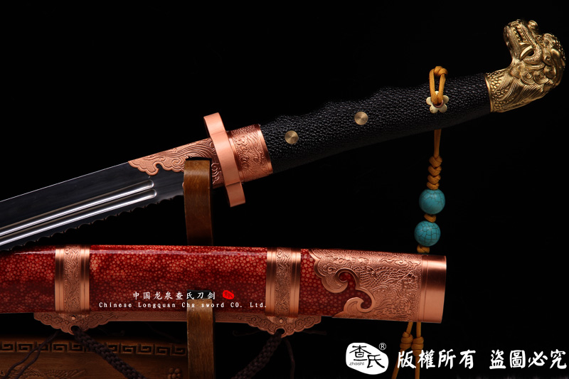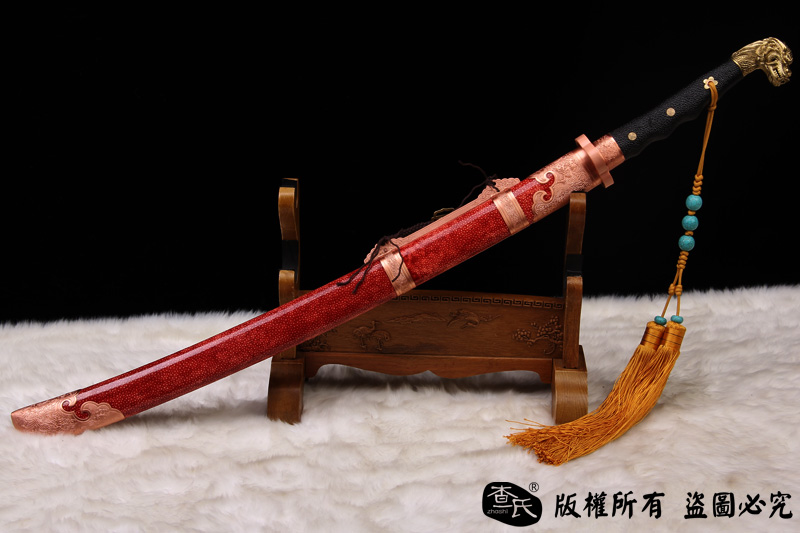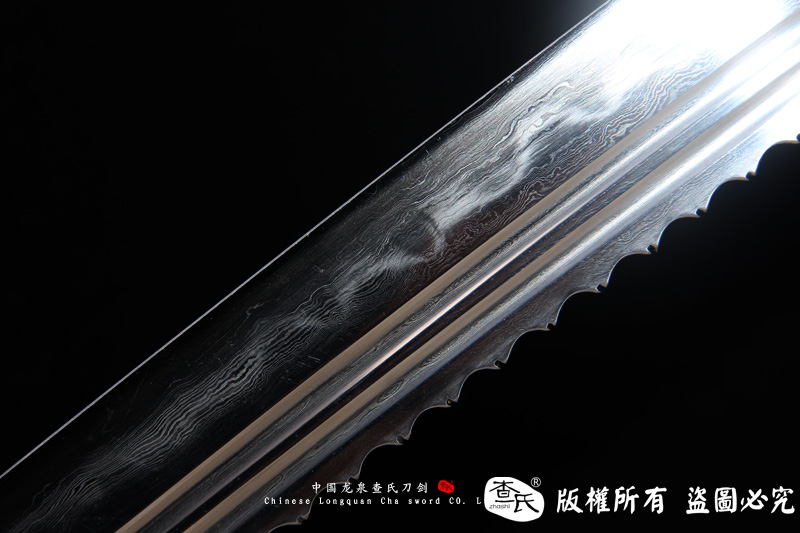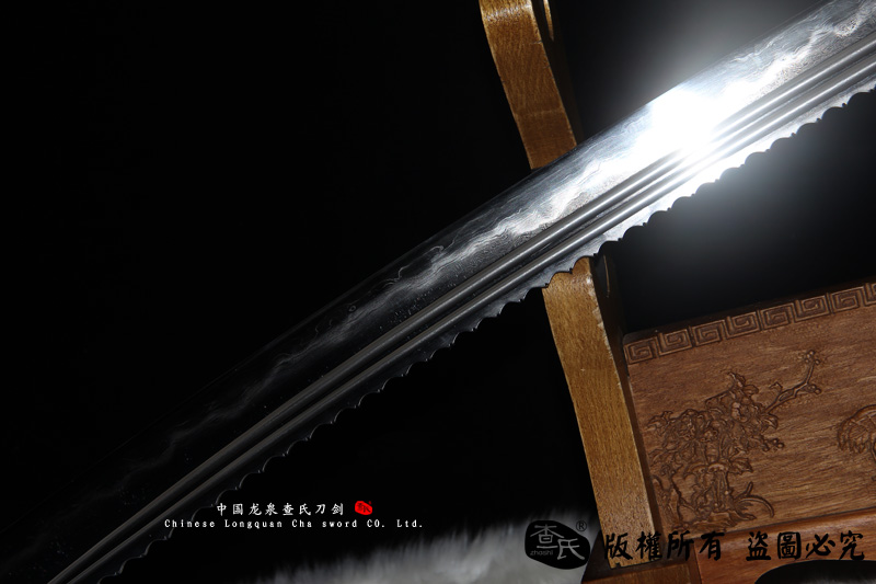 【剑身工艺】 手工锻造百炼钢加 三枚合古法夹钢工艺,加敷土烧刃热处理 古法精细磨,手工开槽和手工制作刀背 。