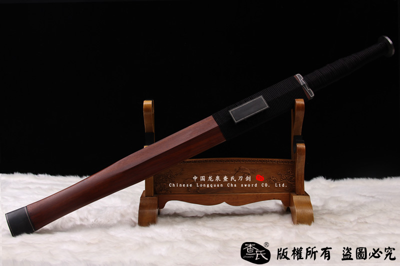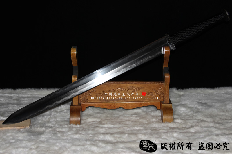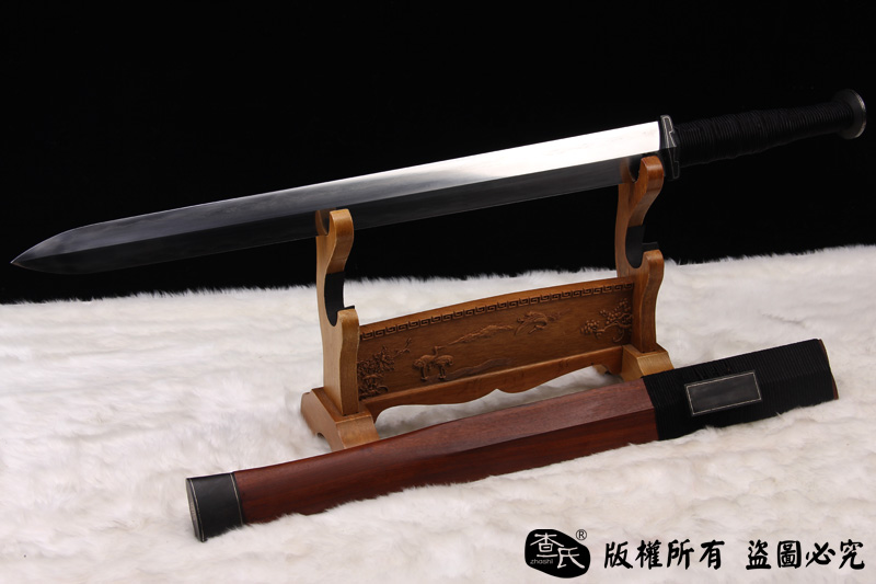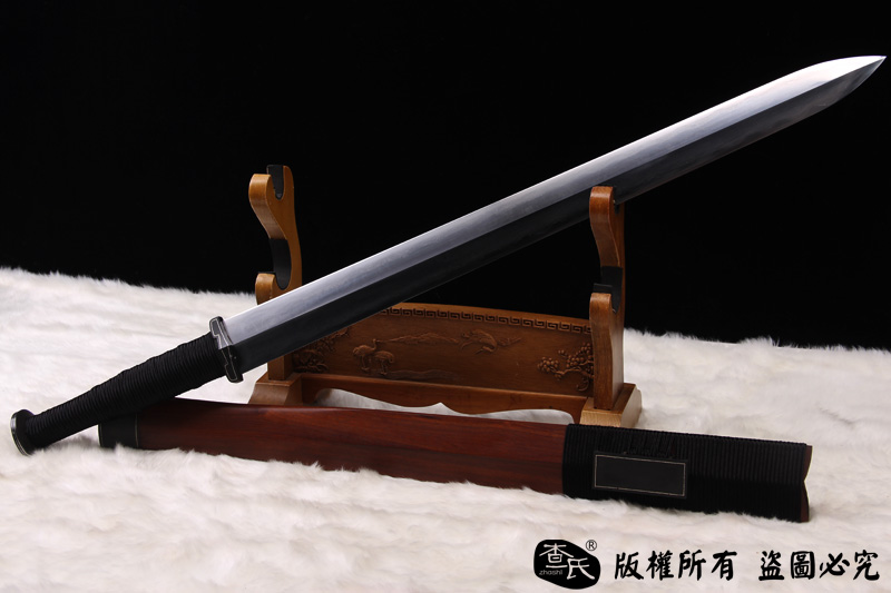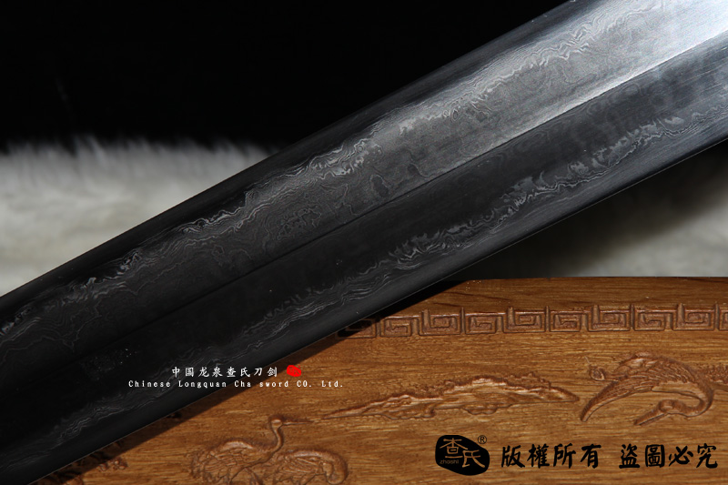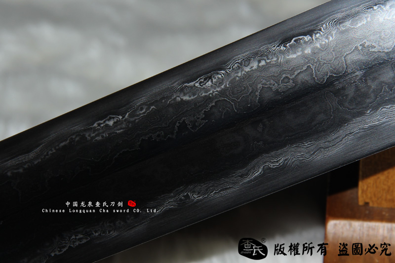 【剑身工艺】 查氏百炼钢,古法手工打造,古法敷土烧刃热处理,手工精细磨,可以砍钢筋,微型冲锋枪10米距离射击宝剑刃口,宝剑刃口完好无损,子弹被劈开
