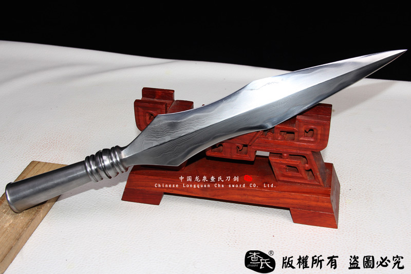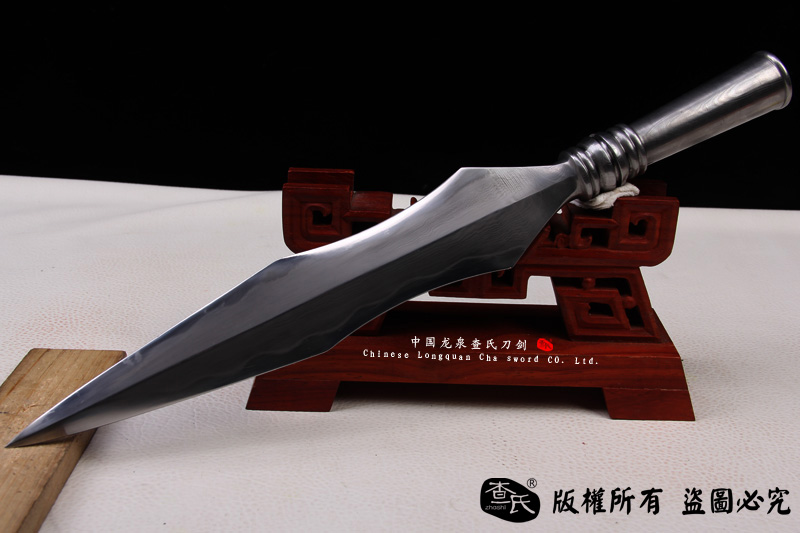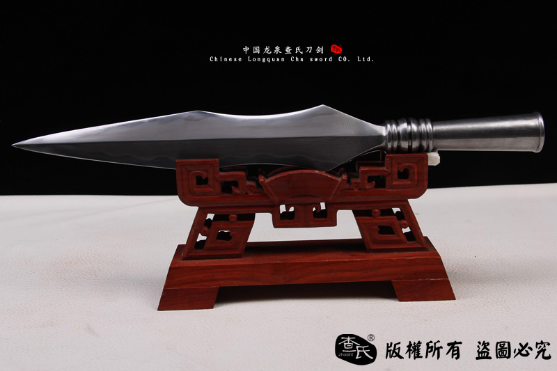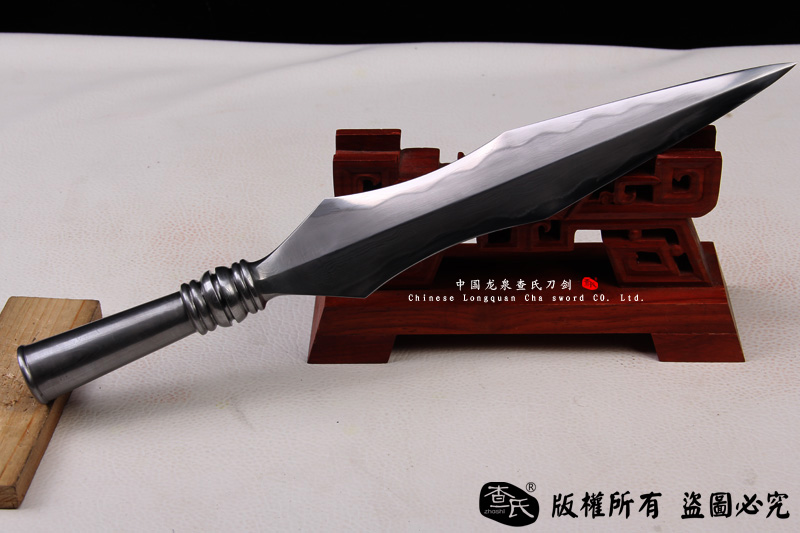 【作品简介】 本店商品均实物拍摄,细节清晰,可仔细比较。 【作品可选】 专业定做,以质论价。可以根据自己的要求定做。 【作品规格】 全长:44cm左右, 刃长:31cm,刃宽:5.8cm,刃厚:1.2cm,重量:1.0kg左右 【剑身工艺】 百炼钢一体打造,古法覆土烧刃热处理,手工精细磨 【作品硬度】 60HRC 【作品赠品】 锦盒 证书 【其他事项】 手工产品,重量尺寸稍有误差,请以实物为准。 此款没有架子赠送,如需要图上的展示架子另外加180。