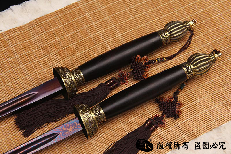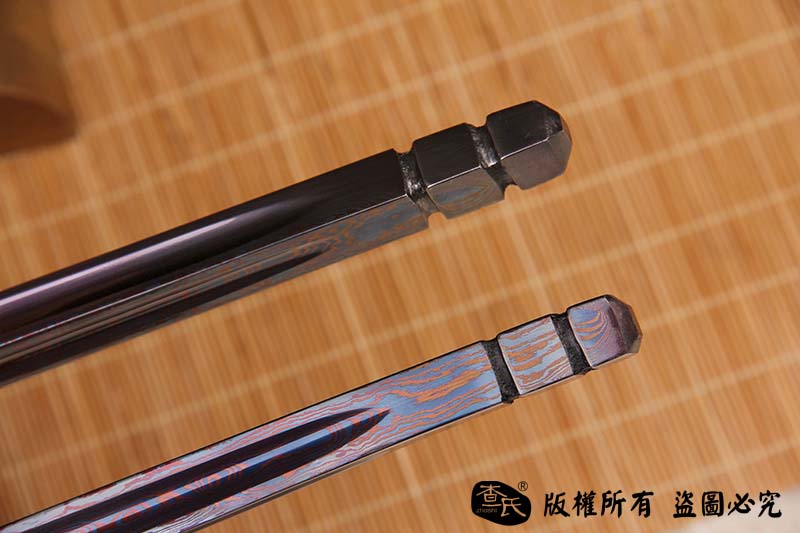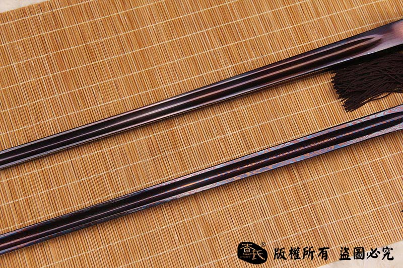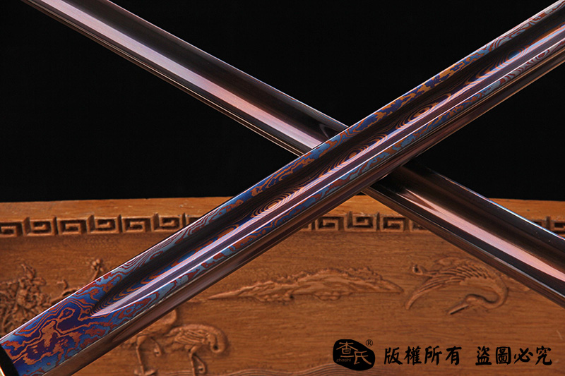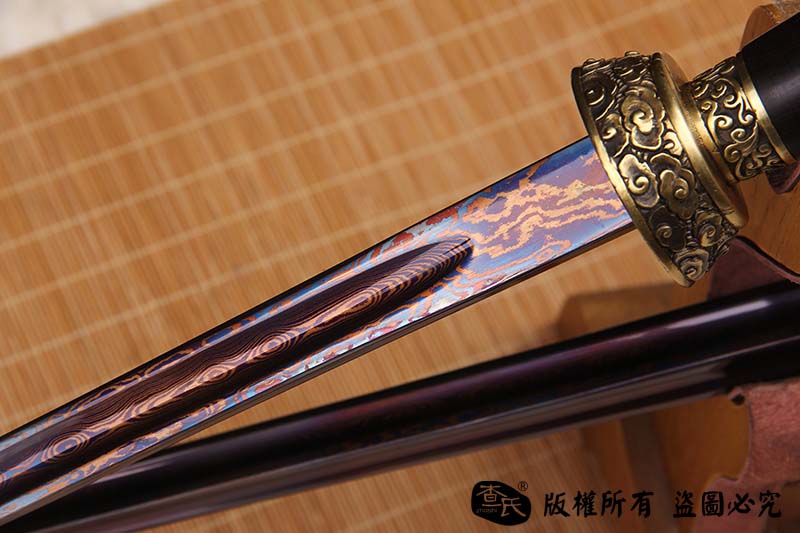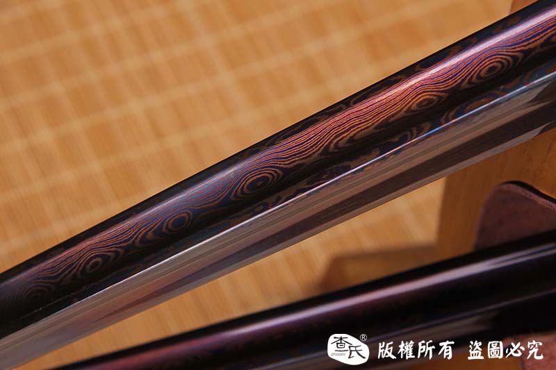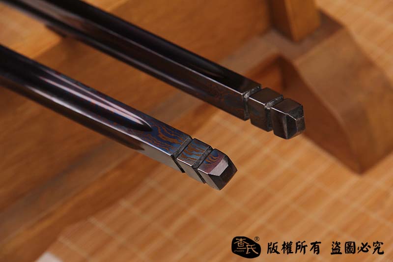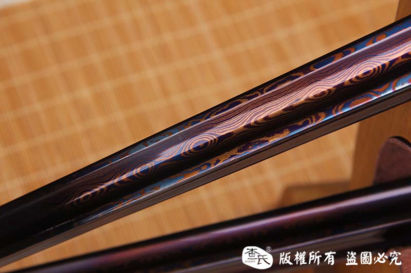 【刃材工艺】 古法百炼钢手工打造,古法热处理,手工开槽,手工精细磨,使用金属烤蓝技术, 锻造纹路精美呈现。