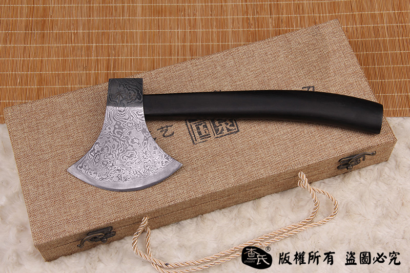 【作品简介】 本店商品均实物拍摄,细节清晰,可仔细比较。 【作品规格】 全长:34cm左右,柄长:26cm,刃长:12.5cm,刃宽:12.8cm,刃厚:2.5cm,重量:0.8kg左右。 【刃材工艺】 百炼花纹钢手工古法一体打造,古法热处理 【作品柄材】 名贵黑檀木柄 【作品赠品】 锦盒 图片款架子 证书 【其他事项】 手工产品,重量尺寸稍有误差,请以实物为准。