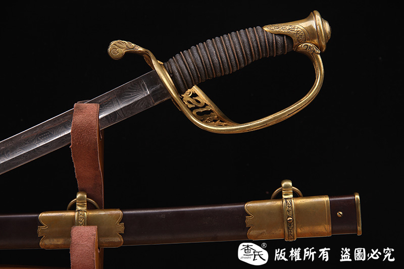 79.4厘米的弯刀(沿着脊柱),卷轴和美国的军事蚀刻,“W.HORSTMANN/&son/费城”刻在右边脊椎底部的“铁证”。左边有一个加冕的人物标志。刀柄是真金镀金的黄铜,有花和“U S”的图案,镂空设计护手盘。金剑结。金线包裹的鲨鱼皮握柄完好无损。铆合结构握柄坚固的。