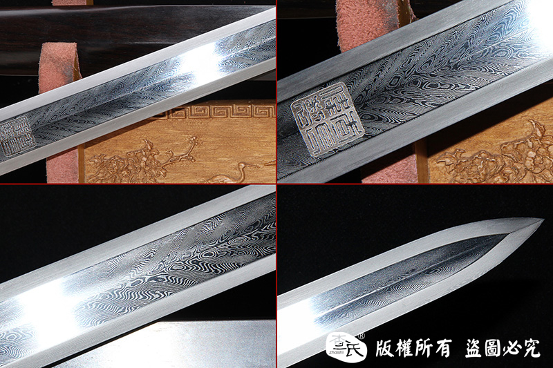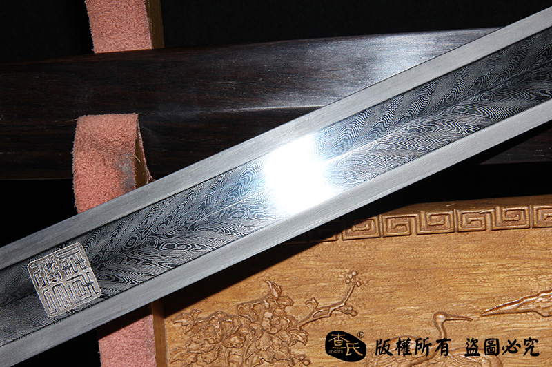 【刃材工艺】 查氏百炼花纹钢孔雀纹手工古法锻打,古法热处理,手工精细磨,细节精美,根部刻字:查长伟制
