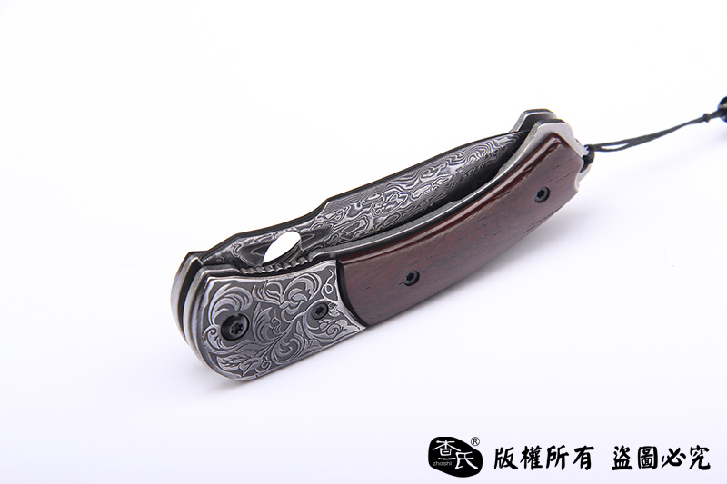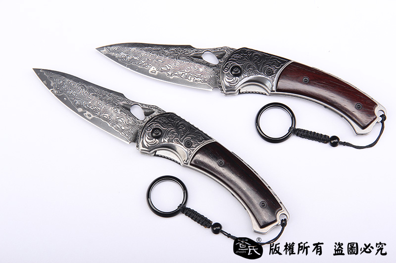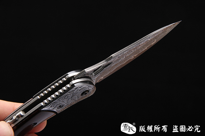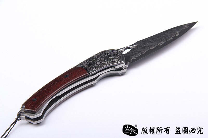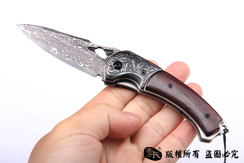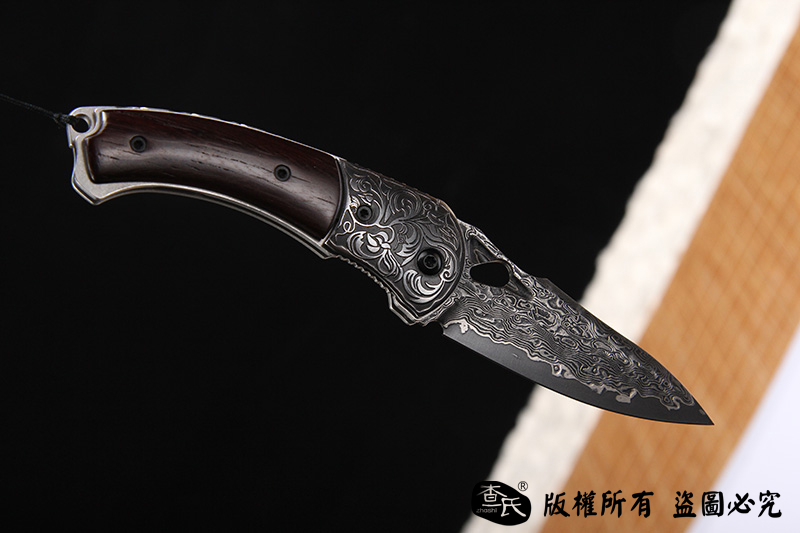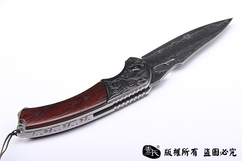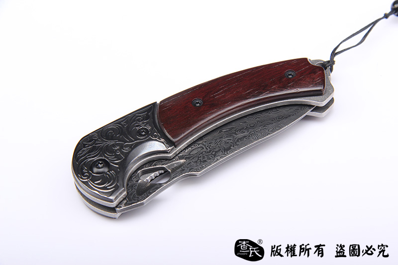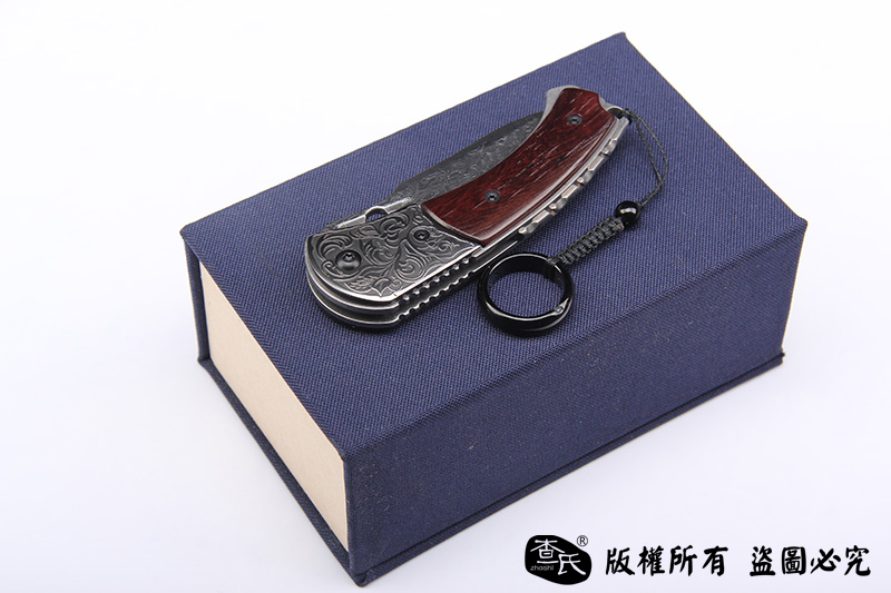 【作品简介】 本店商品均实物拍摄,细节清晰,可仔细比较。 【作品规格】 全长:16.2cm左右,柄长:9.3cm,刃长:6.8cm,刃宽:2.5cm,刃厚:0.24cm,净重:0.1kg左右,带盒0.24kg左右。 【刃材工艺】 大马士革锻打祥云纹夹钢VG10,精工抛镜光刀刃,开合顺滑 【作品装具】 不锈钢刀隔刻唐草,背部手工锉花 【作品硬度】 60HRC 【作品柄材】 老料大叶紫檀木柄 【作品赠品】 礼盒 皮套