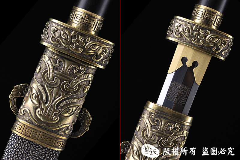 【作品规格】 全长:78cm左右,柄长:19cm,刃长:55cm,刃宽:3.4cm,刃厚:0.8cm,重量:不带鞘1.1kg左右,带鞘2.1kg左右。