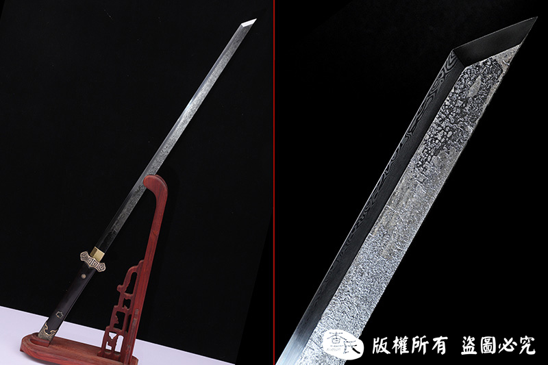 【刃材工艺】 刃采用百炼钢手工古法打造,古法热处理,采用“粗中有细”工艺制作(粗中有细:古法制作,剑刃精磨,上面部分保持原始锻造面,鲜明对比,非常精美)。性能非常好,可以砍铁削纸