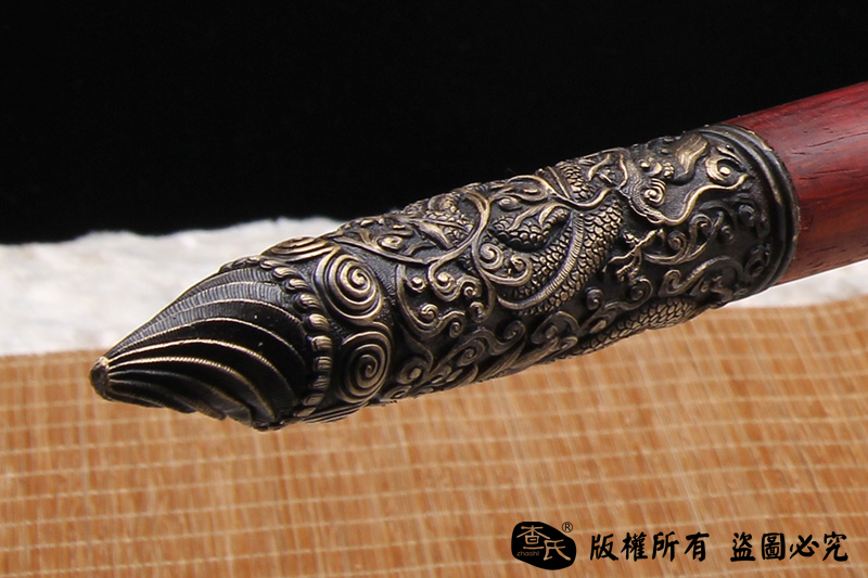 【作品规格】 全长:210cm左右,柄长:160cm,刃长:32cm,刃宽:6.2cm,刃厚:0.9cm,重量:不带鞘2.5kg左右,枪头长:42.5cm。