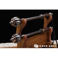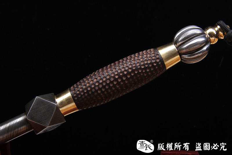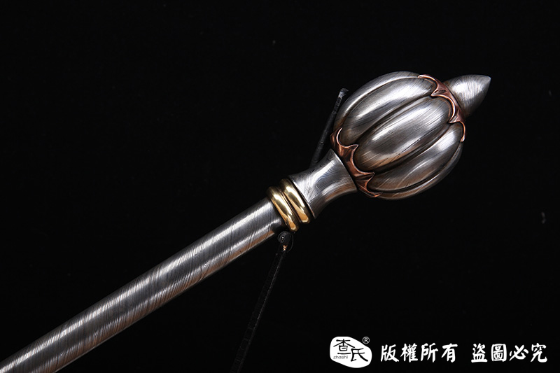 【作品简介】 本店商品均实物拍摄,细节清晰,可仔细比较。 【作品规格】 全长:53cm左右,柄长:17.5cm,杆长:20cm,锤头直径:6.0cm,杆径:1.8cm,重量:单支2kg左右。 【刃材工艺】 终极收藏—高难度百炼钢锤,实心百炼钢打造锤头,手工雕刻瓜棱形,扭转纹打造锤棒,中间点缀紫铜黄铜,檀木雕刻手柄,柄尾为手工雕刻小瓜棱形百炼钢。 【作品赠品】 锦盒 架子 证书 【其他事项】 手工产品,重量尺寸稍有误差,请以实物为准。 赠品里面的架子并不是图上的展示的架子,图片架子另外加180。