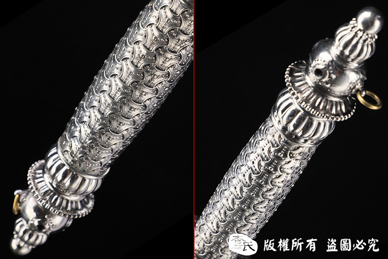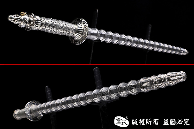 【作品简介】 本店商品均实物拍摄,细节清晰,可仔细比较。 【作品规格】 全长:76cm左右,柄长:18cm,刃长:58cm,尖径:1.5cm,根径:3.2cm,重量:2.9kg左右。 【刃材工艺】 不锈大马士革手工打造,全手工制作和雕刻,工艺难在复杂棱行手工制作+手工钢刻,做好后成色漂亮,收藏价值高,国内为数不多的好锏 【作品装具】 白铜 【作品柄材】 白铜 【作品赠品】 锦盒 架子 配大师证书 【其他事项】 手工产品,重量尺寸稍有误差,请以实物为准。