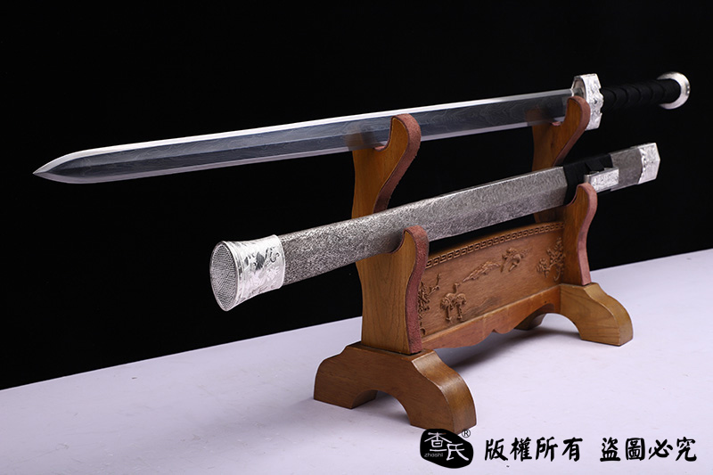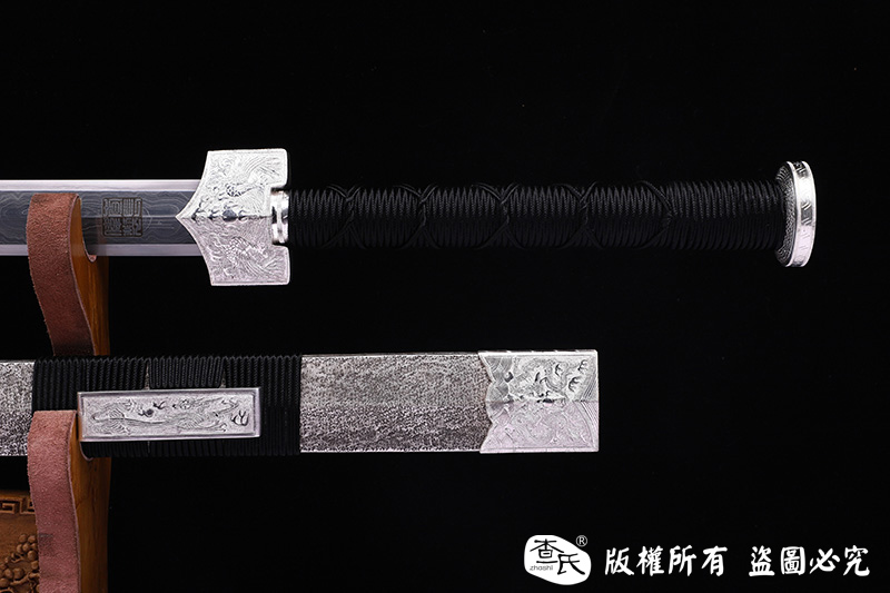 【刃材工艺】 手工天铁(技艺要求高)锻造+古法夹钢(难上加难)+禾字号自家传承水墨纹锻造(工艺复杂)(同时突破三个难点-禾字号代表性传承技艺),做到天铁剑也是刚柔并济的效果,手工精细磨,形成禾字号标志性的天铁水墨山峰纹路,非常漂亮。查老师的代表性作品之一。
