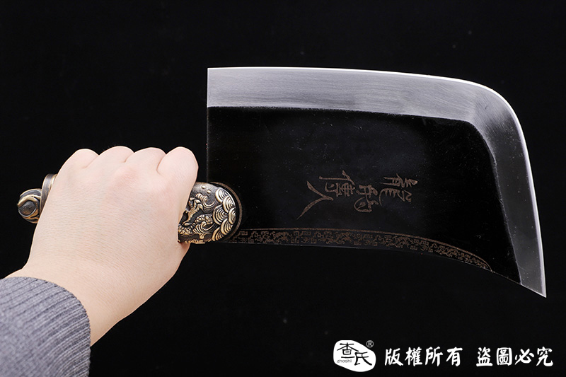 【作品简介】 本店商品均实物拍摄,细节清晰,可仔细比较。 【作品规格】 全长:34cm左右,柄长:13cm,刃长:22cm,刃宽:14.5cm,刃厚:0.6cm,重量:1.3kg左右。 【刃材工艺】 高碳钢手工打造,古法热处理,手工精细磨 【作品硬度】 57HRC 【作品柄材】 手工铜装 【作品赠品】 锦盒 证书 【其他事项】 手工产品,重量尺寸稍有误差,请以实物为准。