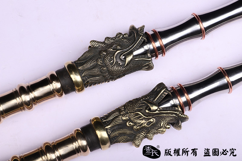 【作品简介】 本店商品均实物拍摄,细节清晰,可仔细比较。 【作品规格】 全长:87cm左右,柄长:20cm,刃长:60cm,直径:2.1-3.1cm,重量:不带鞘2.5kg左右。 【刃材工艺】 不锈钢手工打造,竹节造型,节的位置嵌紫铜 【作品装具】 全铜精细打造 【作品柄材】 全铜精细打造 【作品赠品】 礼盒 礼袋 红木立架 收藏证书 袋子 【其他事项】 手工产品,重量尺寸稍有误差,请以实物为准。