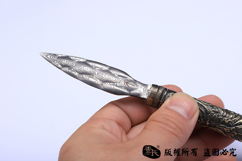 【作品规格】 全长:15.9cm左右,柄长:9.3cm,刃长:6.6cm,刃宽:1.7cm,刃厚:0.4cm,重量:0.08kg左右。