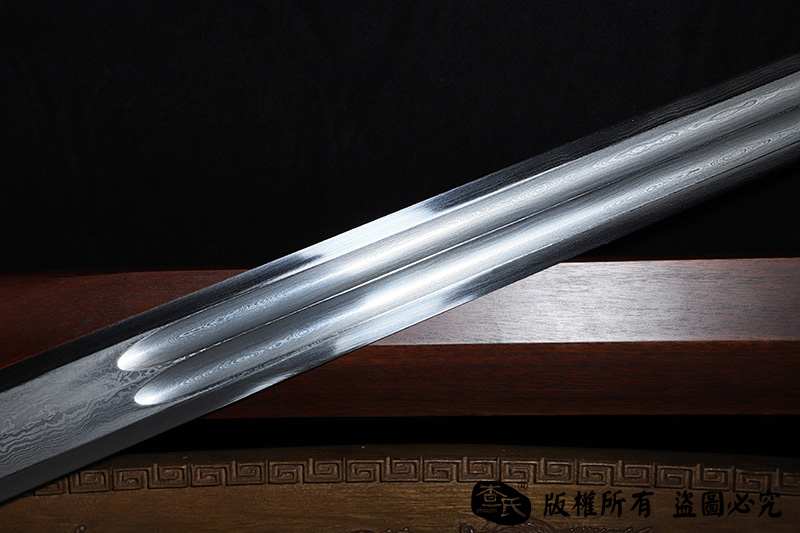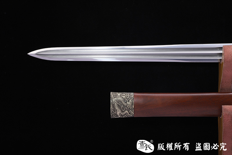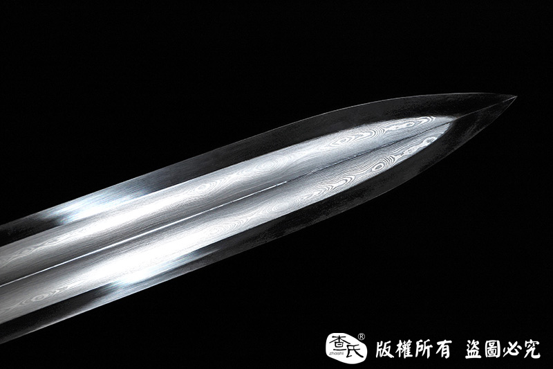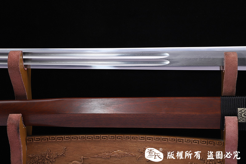 【刃材工艺】 禾字号百炼钢手工打造,古法热处理,手工精细磨+研磨,手工开经典双凹槽,很好的平衡汉剑的手感,根部刻字:查长伟制