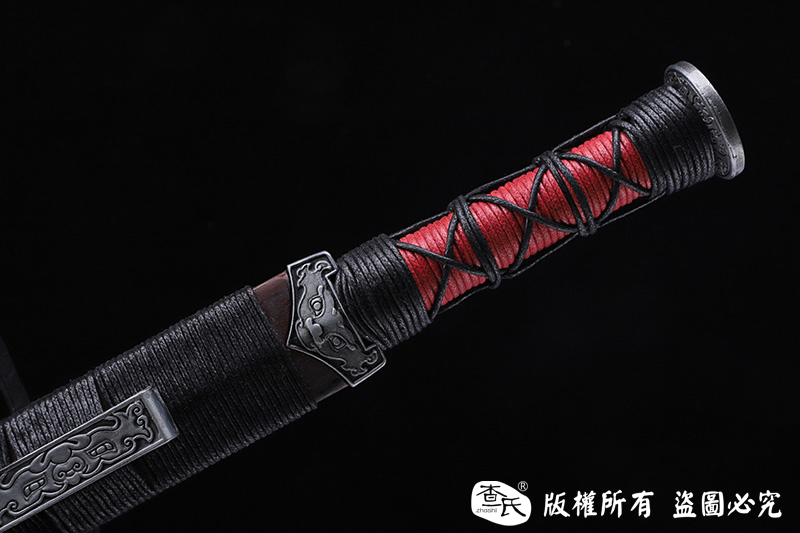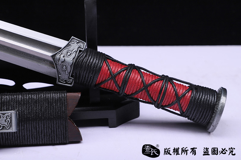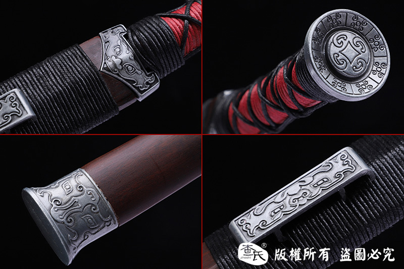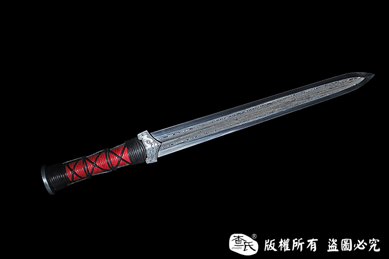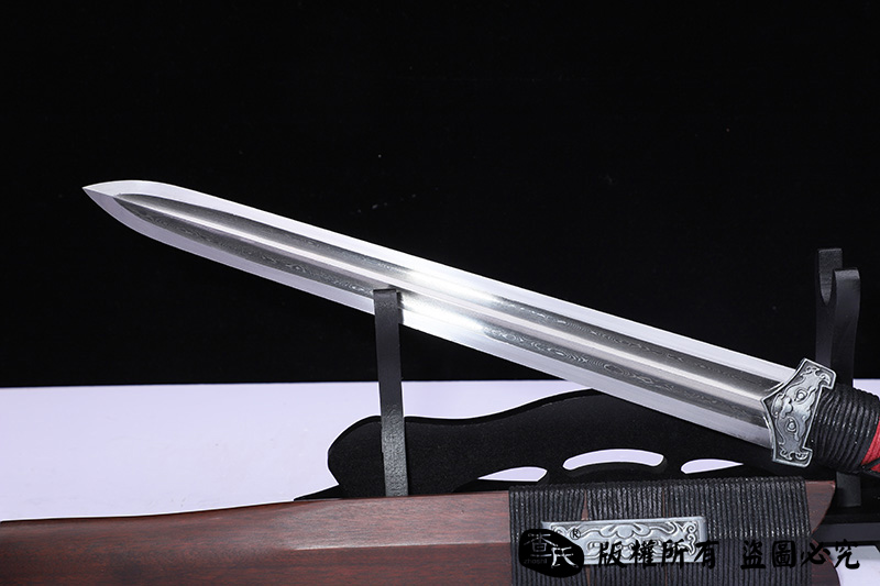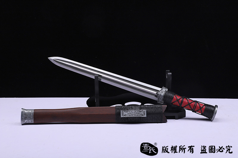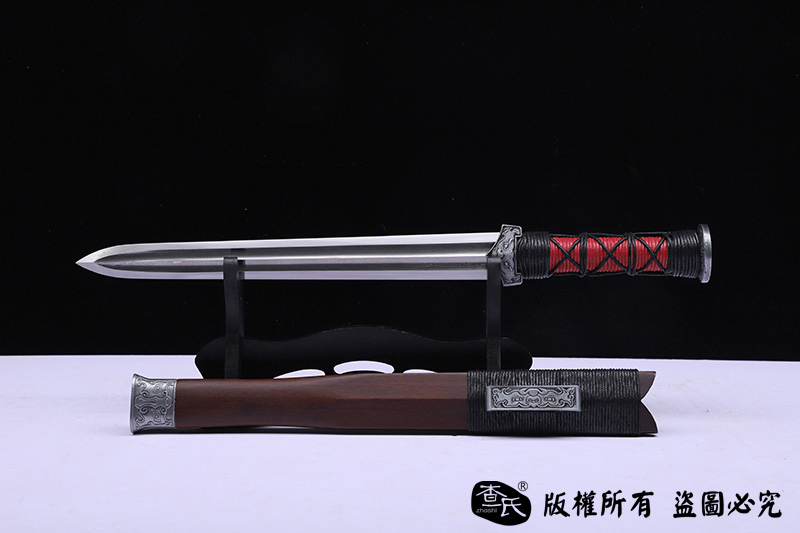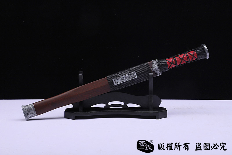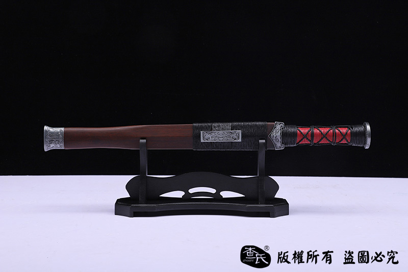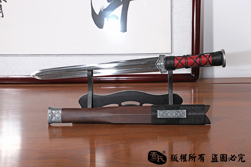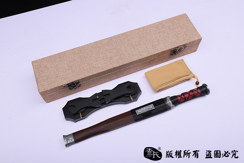【作品简介】 本店商品均实物拍摄,细节清晰,可仔细比较。 【作品规格】 全长:46cm左右,柄长:12cm,刃长:30cm,刃宽:3.3cm,刃厚:0.8cm,重量:不带鞘0.4kg左右,带鞘0.6kg左右。 【刃材工艺】 优质花纹钢打造,古法热处理,手工精细磨 【作品鞘材】 名贵酸枝木 【作品装具】 合金 【作品硬度】 57HRC 【作品柄材】 标准汉剑古法结构 【作品赠品】 锦盒 架子 证书 袋子 【其他事项】 手工产品,重量尺寸稍有误差,请以实物为准。