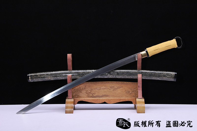 【作品简介】 本店商品均实物拍摄,细节清晰,可仔细比较。 【作品规格】 全长:92.7cm左右,柄长:19cm,刃长:70cm,刃宽:3.2cm,刃厚:0.7cm,重量:不带鞘0.87kg左右,带鞘1.23kg左右。 【刃材工艺】 【作品鞘材】 【作品装具】 【作品硬度】 HRC 【作品柄材】 【作品赠品】 锦盒 架子 证书 【其他事项】 手工产品,重量尺寸稍有误差,请以实物为准。 赠品里面的架子并不是图上的展示的架子,图片架子另外加180。