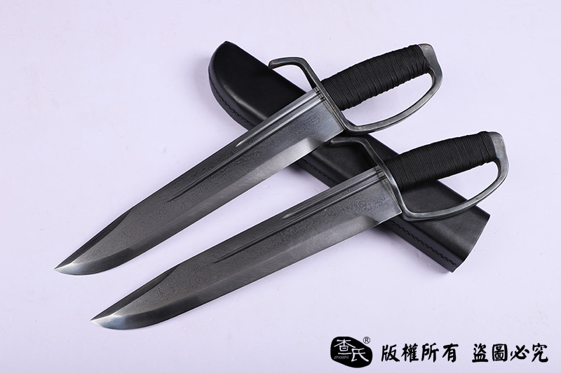 【作品规格】 全长:带鞘48cm左右,净长45cm左右,柄长:12.5cm,刃长:32cm,刃宽:5.5cm,刃厚:0.6cm,重量:不带鞘0.9kg左右/个,带鞘2.1kg左右/对。