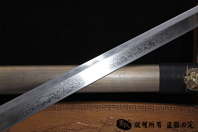 【刃材工艺】 百炼花纹钢手工打造,古法敷土烧刃热处理,手工精细磨,根部刻字:查长伟制