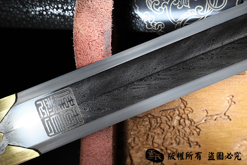 【刃材工艺】 全手工古法锻造光复级孔雀纹百炼钢,古法热处理,手工精细磨,性能优越,花纹精美极其细腻,收藏价值高,查老师代表技术之一,配老师手写证书,根部刻有印章:查长伟制