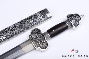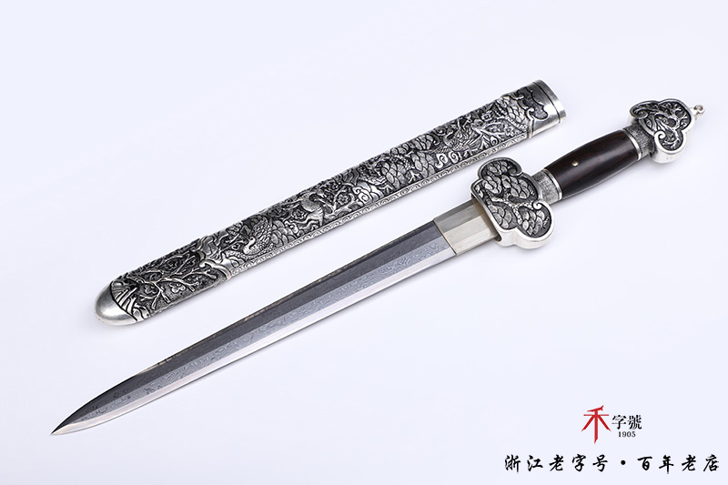 【作品规格】 全长:55cm左右,柄长:14cm,刃长:34cm,刃宽:3.4cm,刃厚:0.8cm,重量:不带鞘0.7kg左右,带鞘1.4kg左右。