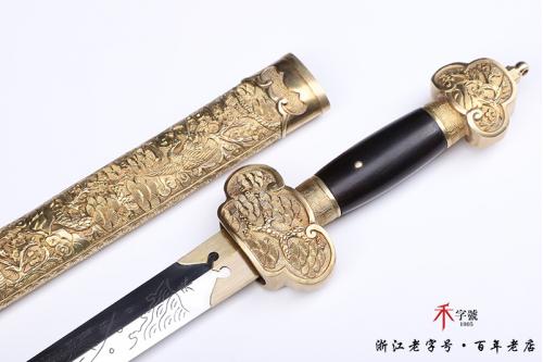 【刃材工艺】 采用耐酸钢手工打造,手工刻古老龙图腾(是清末禾字号作品的独有图腾)以此剑致敬龙泉禾字号老剑工艺,不开刃