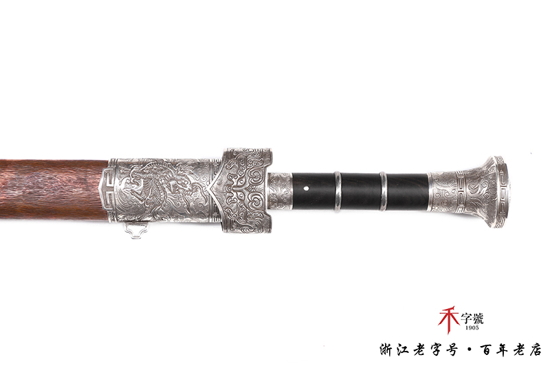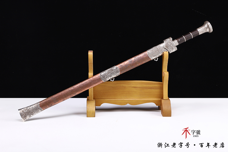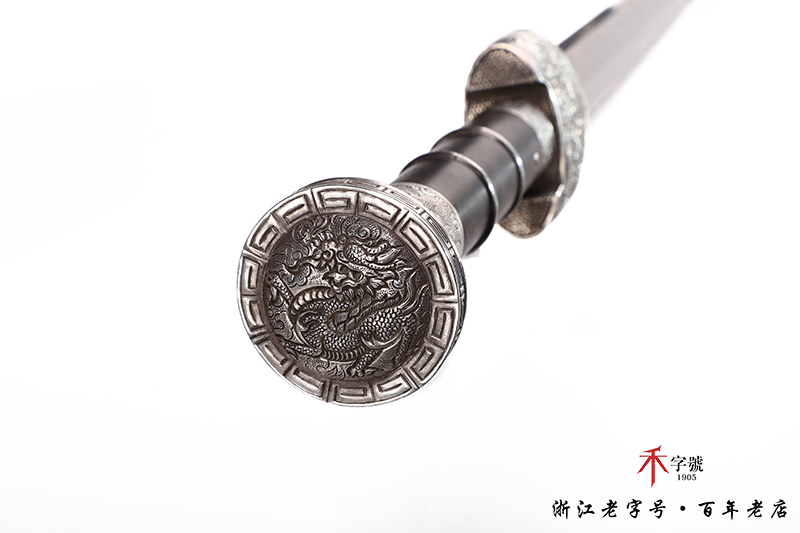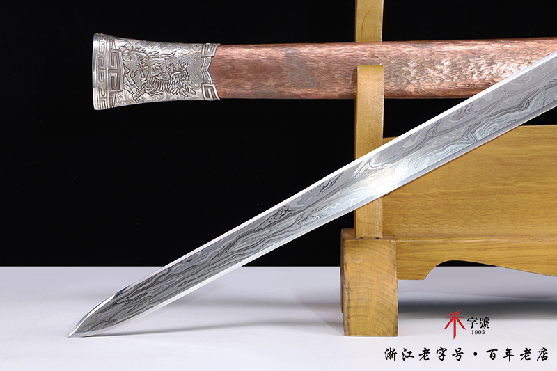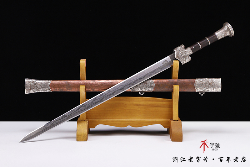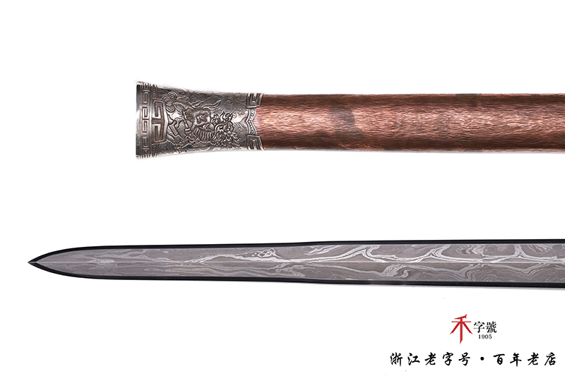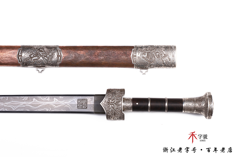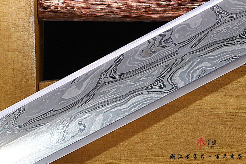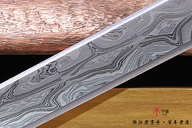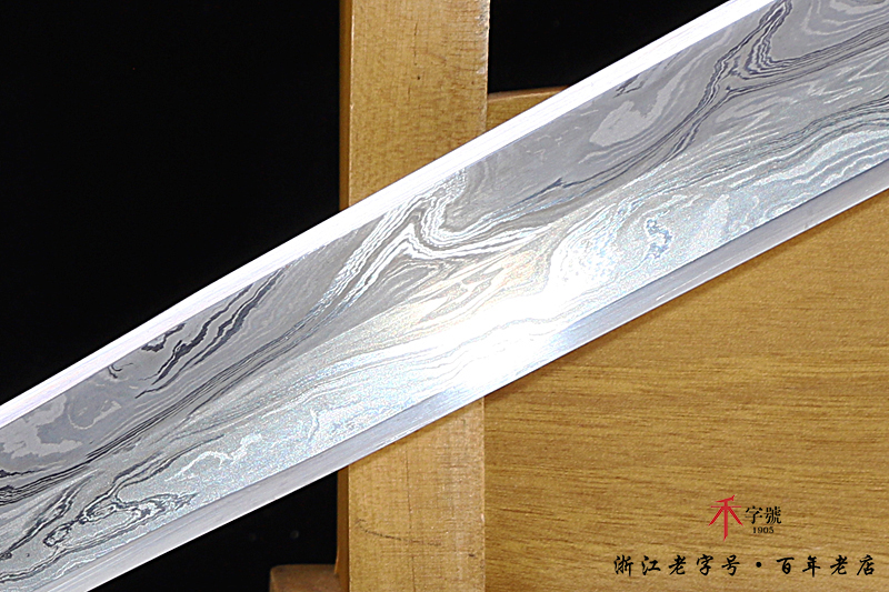 【作品规格】 全长:96.5cm左右,柄长:19.5cm,刃长:64cm,刃宽:4.12cm,刃厚:0.82cm,无鞘重:1.56kg左右,带鞘 2.61kg左右。刃材工艺】 采用陨铁锻造,禾字号独家高难度的古法手工锻造+古法夹钢,陨铁水墨画纹路再夹钢成色漂亮,意境丰富,根部刻字:查长伟制