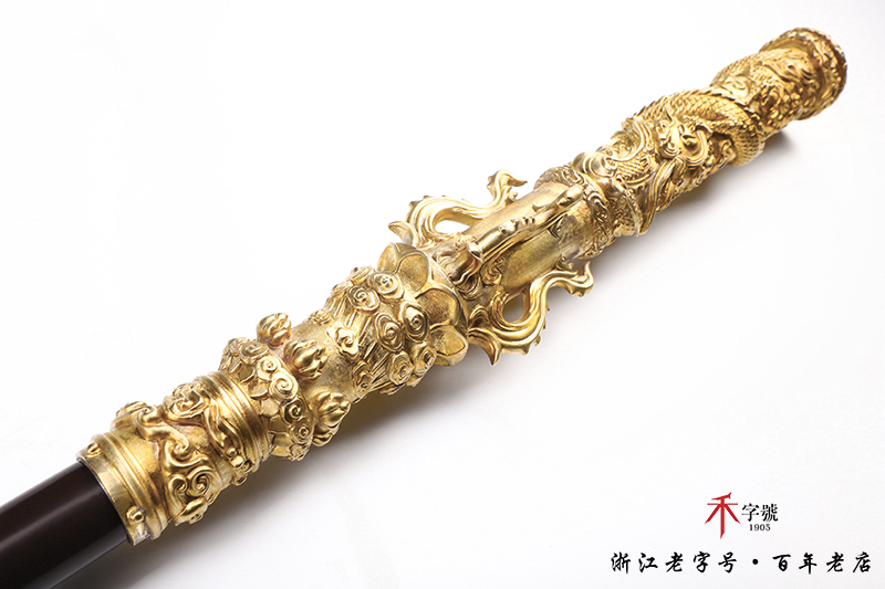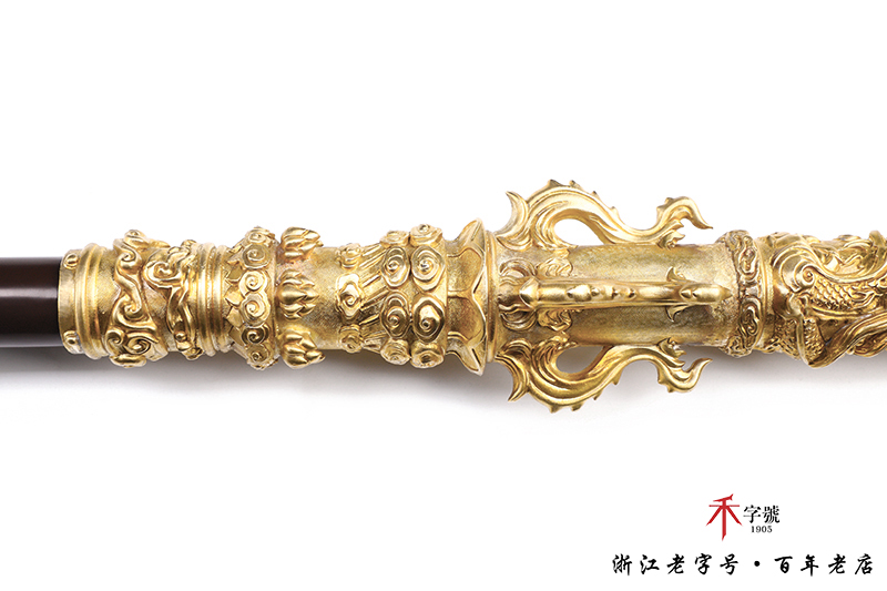 【作品规格】 全长:200cm左右,中间棍子长:110cm左右,中间杆棍子直径:3.2cm,两头雕花装饰头直径:5cm,总重:8.58kg左右。【制作工艺工艺】全手工雕刻精细的铜装(市面上的都是普通铸造铜),棒身是坚固不锈钢打造,烤漆处理,手工描金字。这个可以说是金箍棒中的大哥了。这个黄铜装具并没有镀金是,是黄铜本色,时间长了是会氧化正常的。【作品赠品】 锦盒 架子 证书【其他事项】 手工产品,重量尺寸稍有误差,请以实物为准。赠品里面的架子并不是图上的展示的架子,图片架子另外加180。![]()
